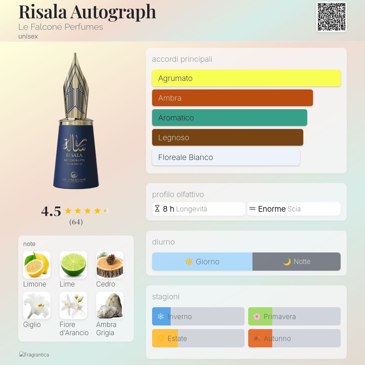 Risala Autograph di Le Falconé Perfumes è una fragranza del gruppo Woody Aromatic unisex. È una nuova fragranza. Risala Autograph è stato lanciato sul mercato nel 2025. Le note di testa sono Limone, Lime, Ribes Nero, Pepe Rosa, Timo e Mela; le note di cuore sono Giglio, Fiore d’Arancio, Muschio di Quercia, Labdano e Cocco; le note di base sono Legno di Cedro, Ambra Grigia, Muschio Vegetale, Cuoio, Ambra, Erba Mate, Fava Tonka e Bacche di Ginepro.