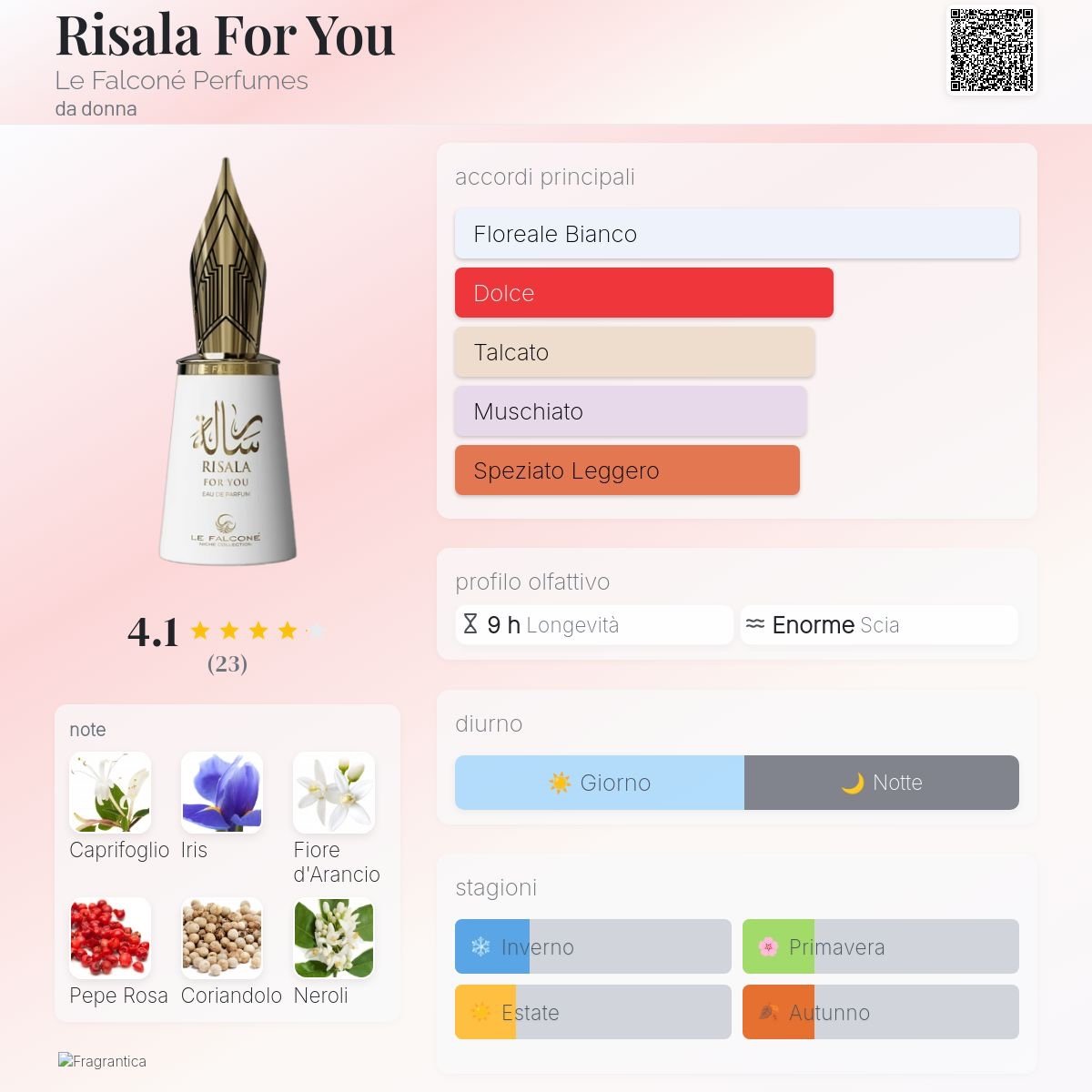 Risala For You di Le Falconé Perfumes è una fragranza del gruppo Oriental Floral da donna. È una nuova fragranza. Risala For You è stato lanciato sul mercato nel 2025. Le note di testa sono Caprifoglio, Fiore d’Arancio, Pepe Rosa, Coriandolo e Neroli; le note di cuore sono Iris, Gelsomino, Marshmallow e Rosa; le note di base sono Labdano, Muschio, Vaniglia, Zucchero e Caramello.